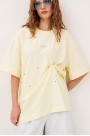 Джемпер трикотажный прямого силуэта со спущенной линией плеча и втачным рукавом. Полочка с принтом 'I'M BULOCHKA'. По полочке и спинке установлены кнопки, благодаря которым джемперу можно придать другой силуэт и задрапировать интересным способом. По горловине притачная планка из основной ткани.
