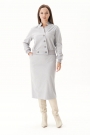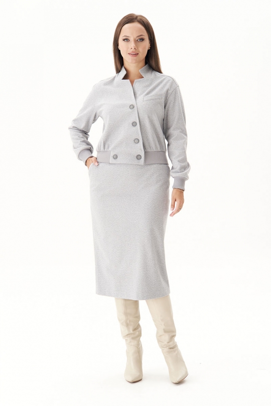 Женские костюмы уже давно стали ответом на вопросы стиля. Костюм - это уже готовый завершенный образ. Один из модных трендов сезона - сочетание юбки длинны миди и укороченного жакета. Модная расцветка, свободный покрой с заниженной линией плеча, воротник - стойка, переходящая в фигурную линию борта. Застежка - двубортная на пуговицы. По низу жакета и рукавов - трикотажный эластичный довяз.
