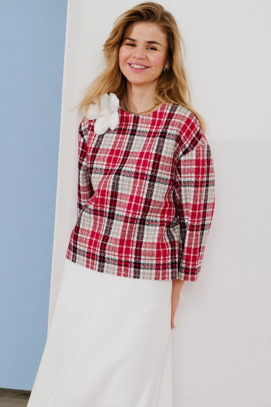 Топ выполнен из текстильной ткани, дизайн клетка, на трикотажной подкладке. Линия плеча спущена, рукав укороченный 3/4. По переду округлый вырез горловины. По спинке застёжка на петли и пуговицы.