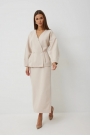 Жакет: – приталенный силуэт – двухбортный – декоративная застёжка петли-пуговицы – спущенный рукав-фонарь – на подкладке Юбка: – приталенный силуэт – застёжка на потайной молнии по спинке – на подкладке – разрез снизу по спинке