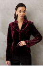 Жакет из велюровой ткани полуприлегающего силуэта, с втачным двухшовным рукавом. Полочка и спинка с отрезной баской по линии талии. Полочка с V-образным вырезом, однобортной застежкой на петли пуговицы и талиевой вытачкой от баски. Спинка с центральным швом. Жакет с отрезным бочком, переходящим на полочку и на спинку. Жакет на подкладке.