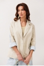 Жакет из джинсовой ткани с велюровым эффектом полуприлегающего силуэта с втачным двухшовным рукавом с лампасом из отделочной ткани. Полочка с центральной застежкой на петлю-пуговицу, вытачкой и имитацией кармана с клапаном. Жакет с отрезным бочком, переходящим на полочку и на спинку. Воротник пиджачного типа с отрезной стойкой. Рукава жакета на подкладке.