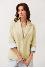 Жакет из джинсовой ткани с велюровым эффектом полуприлегающего силуэта с втачным двухшовным рукавом с лампасом из отделочной ткани. Полочка с центральной застежкой на петлю-пуговицу, вытачкой и имитацией кармана с клапаном. Жакет с отрезным бочком, переходящим на полочку и на спинку. Воротник пиджачного типа с отрезной стойкой. Рукава жакета на подкладке.