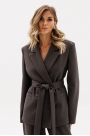 Жакет выполнен из костюмной ткани. Жакет прямого силуэта длиной до линии бедер. Спереди лацканы. Застежка двубортная на обтяжные пуговицы. Воротник пиджачного типа. Спинка со средним швом. Рукав втачного, двухшовный. Жакет на притачной по низу подкладке. В комплект входит съемный пояс из основной ткани.
