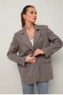 Жакет актуального прямого кроя, выполнен из костюмной ткани. Воротник пиджачного типа с отложными лацканами, край борта скругленный по низу жакета. Спереди обработаны прорезные карманы в рамку с клапанами. Рукава втачные двухшовные со шлицей и пуговицами. Спинка со средним швом, переходящим в высокую шлицу с застежкой на петли и пуговицы. Жакет на подкладке.